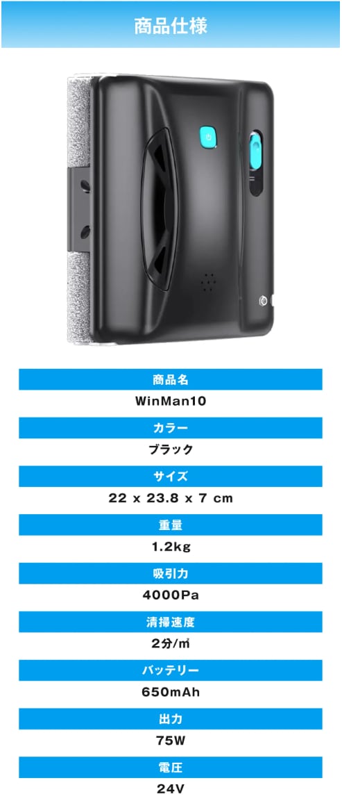 最大4000Paの吸引力を実現し、窓にしっかり密着。停電時も約40分間吸着を維持。